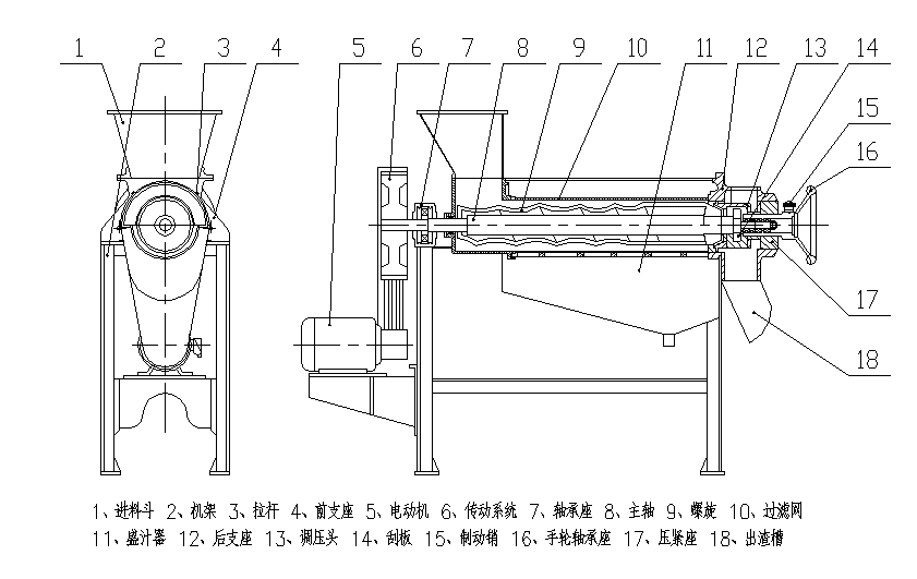 ★ 由前支座、進料斗、螺旋、過濾網、盛汁器、后支座、出渣槽等組成,螺旋主軸左端支撐于滾動軸承座內,右端支撐于手輪軸承座內,電機通過一對三角皮帶驅動螺旋進行工作。
