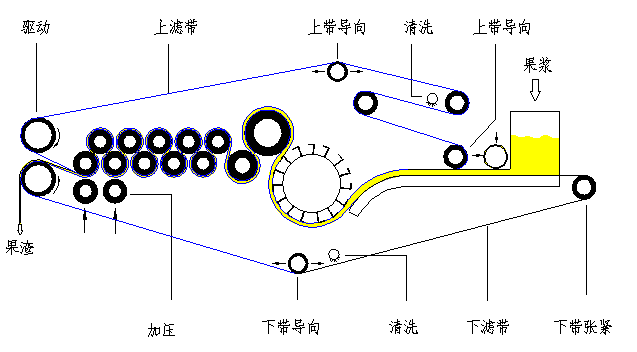 工作時經過細化的原料(固液混合物),有螺桿泵連續進入料斗中(物料占帶寬可調節),內外兩條環狀濾帶在驅動輥帶動下,由壓料輥分布均勻。在下彎的楔形區內,按其各自回路運動,內外濾帶繞過數根不等徑的榨輥,大量水分被緩緩地壓出,形成可壓榨的率餅。在壓榨區內,一個帶“L”型壓條的壓輥將水份壓出,并保證水份從兩邊壓出。以后的壓輥直徑遞減,濾帶呈“S”型,產生遞增的表面壓力的剪切力。在濾帶張力作用下外層濾帶對物料產生壓力將物料中的汁液榨出,由于榨輥直徑逐漸減小,濾帶間物料所受壓力逐漸增加,汁液不斷排出。為了保證最佳的脫水效果,然后物料再繞過驅動輥,在最后兩級榨輥下有二級壓力不同的襯膠壓輥對濾帶自動加壓,進一步將物料中的汁液排出干凈,提高出汁率。在內外濾帶分開后,有耐磨型料刮裝置將內外濾帶工作表面上脫水后的濾餅(果渣)刮下,(為提高刮渣效果,方便榨帶清洗,用戶可選擇增設毛刷進一步刷渣),最后由我公司引進國外的高壓實心錐形凸型噴嘴,形成扇形交叉,壓力在大于1MPa下,流率為4140升/分的情況下不斷沖洗,以保持持續的高壓效果。