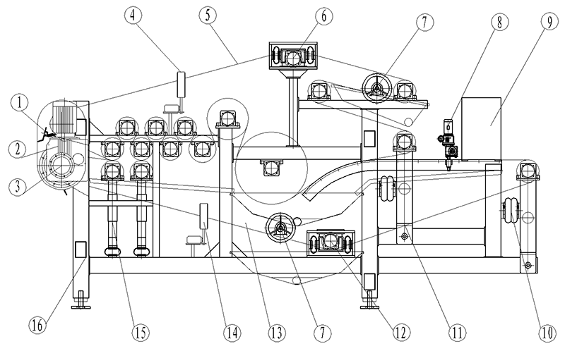 見附示意圖, 該機有機架、上下驅動軸,減速驅動總成,壓輥組合,壓濾帶、清洗帶組件、進料組件、漲緊裝置、帶糾偏組件、增壓裝置、安全保護裝置,氣電控制裝置、清洗水過濾裝置等組成。