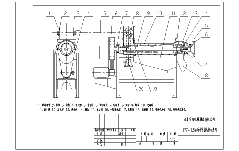 由前支座、進料斗、螺旋、過濾網、盛汁器、后支座、出渣槽等零件組成,螺旋主軸左端支承于滾動軸承座內,右端支承于手輪軸承座中,電動機通過一對三角皮帶輪驅動螺旋進行工作。